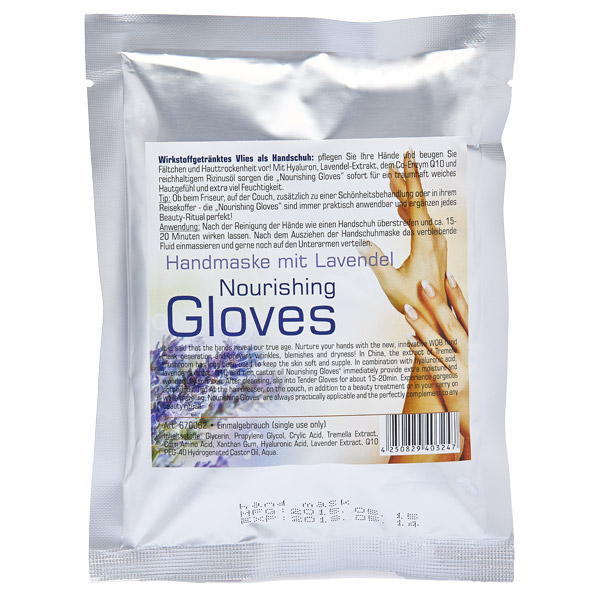 Man sagt, Hände verraten das wahre Alter. Pflegen Sie Ihre Hände mit der neuen, innovativen Handmasken-Generation und beugen Sie Fältchen, Flecken und Trockenheit vor! In Asien nutzt man die Wirkung des Tremella-Pilz Extrakt schon lange, um die Haut weich und geschmeidig zu halten. In Kombination mit Hyaluron, Lavendel-Extrakt, Q10 und reichhaltigem Rizinusöl sorgen die „Nourishing Gloves“ sofort für ein traumhaft weiches Hautgefühl und extra viel Feuchtigkeit. Nach der Reinigung der Hände wie einen Handschuh überstreifen und ca. 15-20 Min. einwirken lassen. Erleben Sie traumhaft zarte Hände mit den neuen „Nourishing Gloves“.